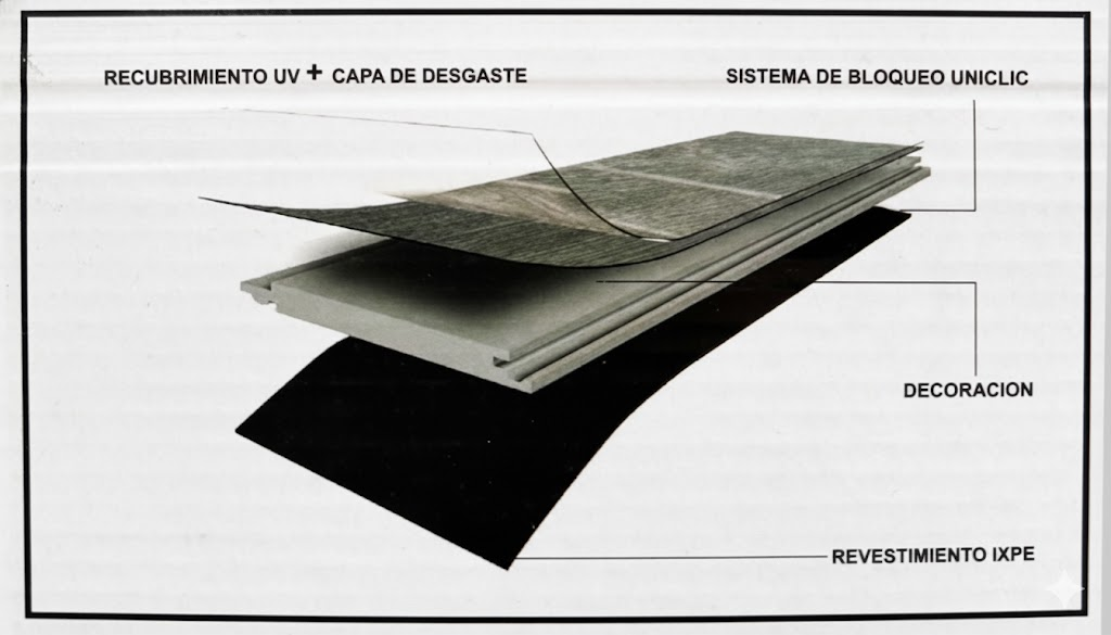 Se consideran la nueva generación de revestimiento de pisos, las características: estable, acústico, texturado, acabado mate, alto rendimiento completamente a prueba de agua y uso comercial interno.